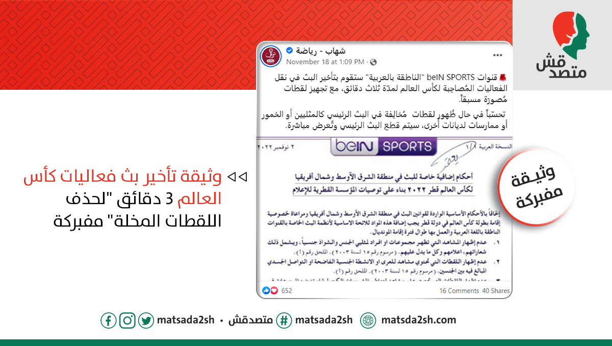 وثيقة منتشرة بشكل كبير جدًا منسوبة لإدارة قنوات "بي إن سبورتس" القطرية، المالكة للحقوق الحصرية لبث كأس العالم في الشرق والأوسط وشمال إفريقيا، مذكور فيها إنه سيتم تأخير بث فعاليات كأس العالم والمباريات 3 دقائق "لحذف أي لقطات مخلة". ❌❌ @beINSPORTS