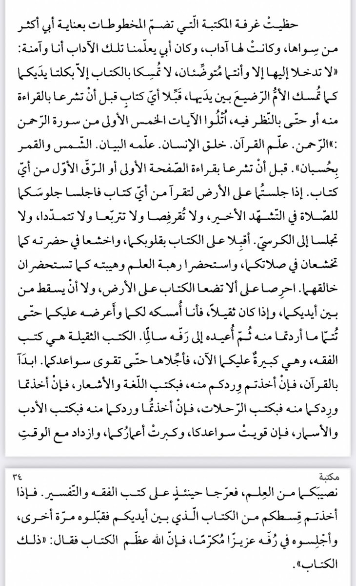 في الرابعةأو الخامسةبعث بي أبي إلى الكتّاب،كنا نرتل خلف الشيخ:«عَم يتساءلون»كانت أوّل ما نطقت من حروف العربية،وأوّل ما ردّدتُ خلف الشيخ،لكن أبي قال للشيخ : «ابدأ معه من ألم . ذلك الكتاب)؛ فإنّ القرآن مثل الموج، مَـن سـار مع اتجاه الموج وصل، ومن سار عكسه أو غالبه غَرِق»