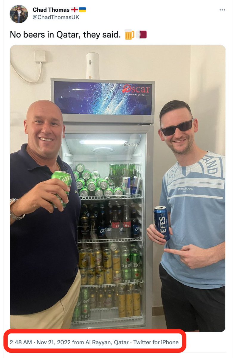 تغريدة قبل ساعة من مغرد إنجليزي حاضر كأس العالم ، لوكيشن التغريدة (الريان ، قطر) كتب فيها "يقولون لا يوجد بيرة كحول في قطر" ، وهو يقف مبتسما يحمل في يده بيرة هو وصديقه ، أمام ثلاجة مليئة ببيرة الكحول. لذلك نقول شكرا #قطر على تقبل ثقافات الآخر.