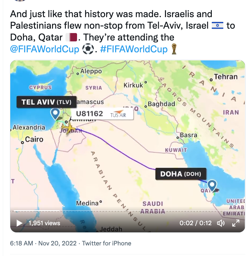 قطر أيضا رسمت صورة جميلة في التعايش عندما رحبت بالطائرات من تل أبيب إسرئيل وعلى متنها إسرائيليون وفلسيطنيون معا لحضور #كأس_العالم_قطر_2022