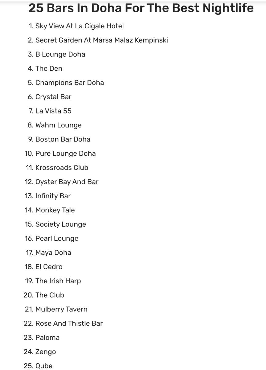 بالرغم من إعلان منظمي #كأس_العالم_قطر_2022 عن منع بيع المشروبات الكحولية في الملاعب ، إلا أن قطر تحتضن العديد من البارات والملاهي الليلة وأماكن الرقص لتناول المشروبات الكحولية والاستمتاع بالحياة الليلية. هنا قائمة لأفضل ٢٥ مرقص وبار في الدوحة ، بالاضافة لبعض الصور.