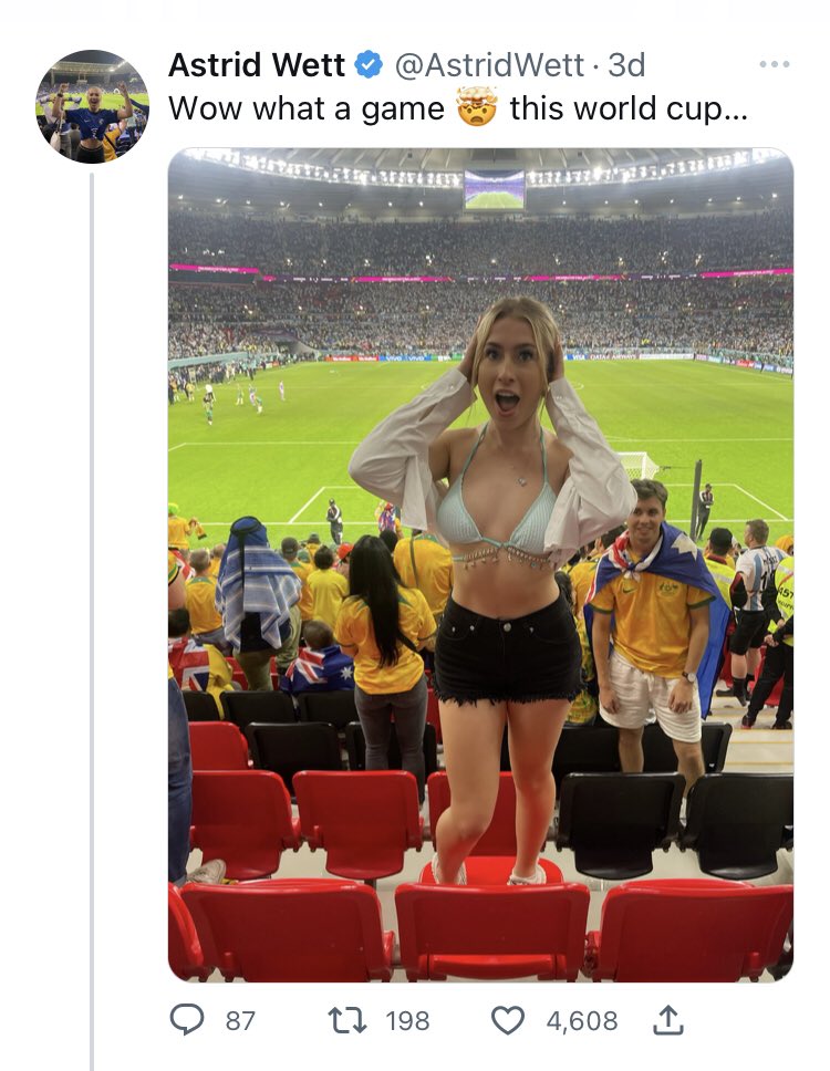 ال بورن ستار ، الممثلة الاباحية الانجليزية "استريد وت" أيضا تم استقبالها في مونديال #كأس_العالم_2022_قطر كجزء من الحملة التسويقية لدعم المونديال ، وعملت على عدة جلسات تصوير احترافية في ملاعب وشواطئ قطر. وعبرت عن حبها لقطر وشكرها للاستضافة والاستقبال.