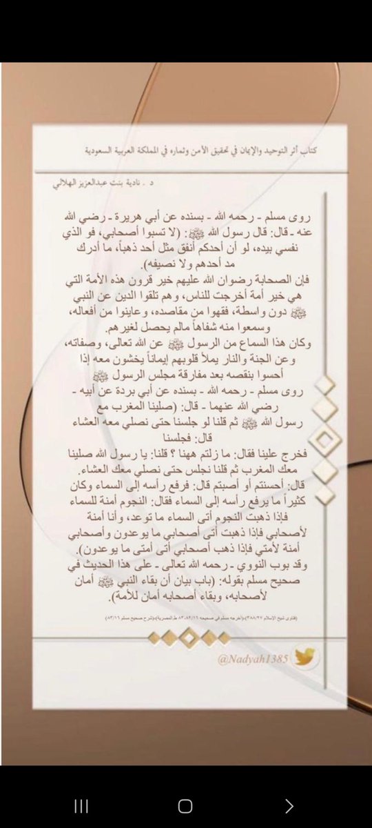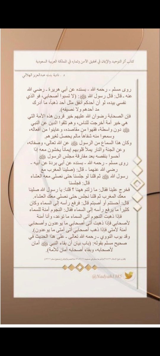 روی مسلم -رحمه الله - بسنده عن أبي هريرة رضي الله عنه - قال: قال رسول الله (لا تسبوا أصحابي، فو الذي نفسي بيده لو أن أحدكم أنفق مثل أحد ذهباً