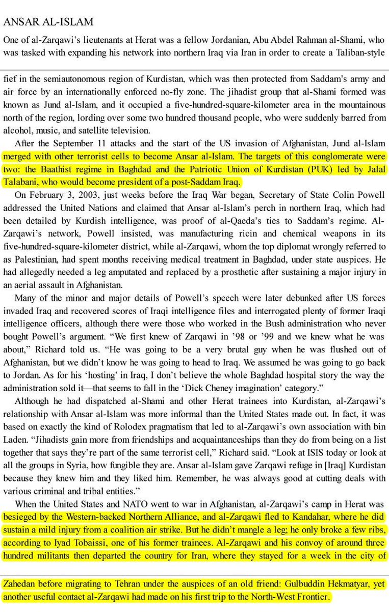 ۴۲- این اطلاعات را فاش کرده اند و مشخصا به ارتباط الزرقاوی با انصارالاسلام در شمال عراق استناد کرده بود. ادعاهایی که هرگز ثابت نشدند!!! اینکه چرا دولت بوش با چنین سیاست توجیه گرانه، فریب کارانه و متوهمانه ای به عراق حمله کرد، بعدها مورد بررسی قرار گرفت. عده ای معتقد