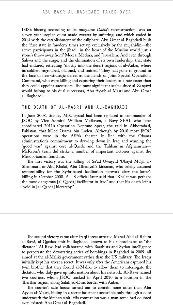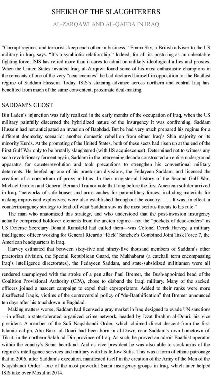 ۷۳- گروه های جهادی تحت استانداردهای الزرقاوی شد. اتحادی که بعدها داعش از دل آن رویید و تله بعدی برای ایالات متحده در عراق را به شرق و شمال سوریه میبرد. داعش بعدا همان گفتمان تمدنی را داشت که الزرقاوی رویایش را در سر داشت. بعدها داعش در اولین شماره نشریه اینترنتی اش به نام "دابق"