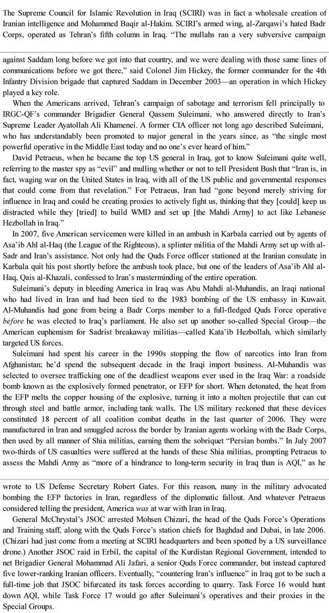 ۹۷- ایران در عراق به شغلی پرتنش و تمام وقت برای امریکا تبدیل شد. ارتش ائتلاف حالا عملا دو شاخه شده بود. یک گروه ضربت بنام AQI-16 که هدفش القاعده و شبکه الزرقاوی بود، و یک گروه ویژه بنام یگان 17 که به تعقیب سلیمانی و افرادش اختصاص یافته بود. همین یگان بود که بعدها کشف کرد سلیمانی