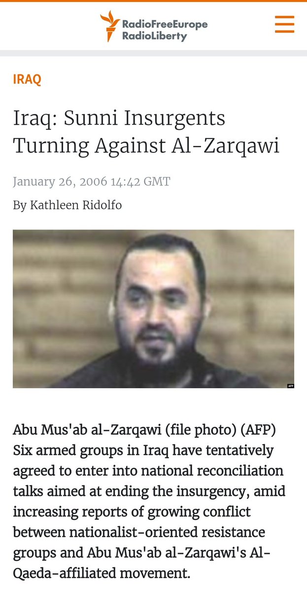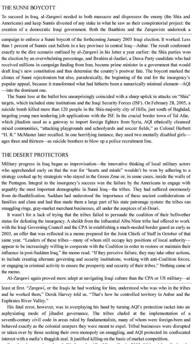 ۸۲- الزرقاوی این قبایل را استعمار کرده بود و این را خیلی دیر فهمید که "ایمان جهاد با شکم خالی" در مدت زمان کوتاهی سست میشود. شبکه او به جای تبدیل شدن به نیروی حفاظتی و حمایتی از قبایل سنی، به مکانیسمی خفه کننده تبدیل شده بود که مردم نواحی مختلفی از جمله الانبار و دره رود فرات را
