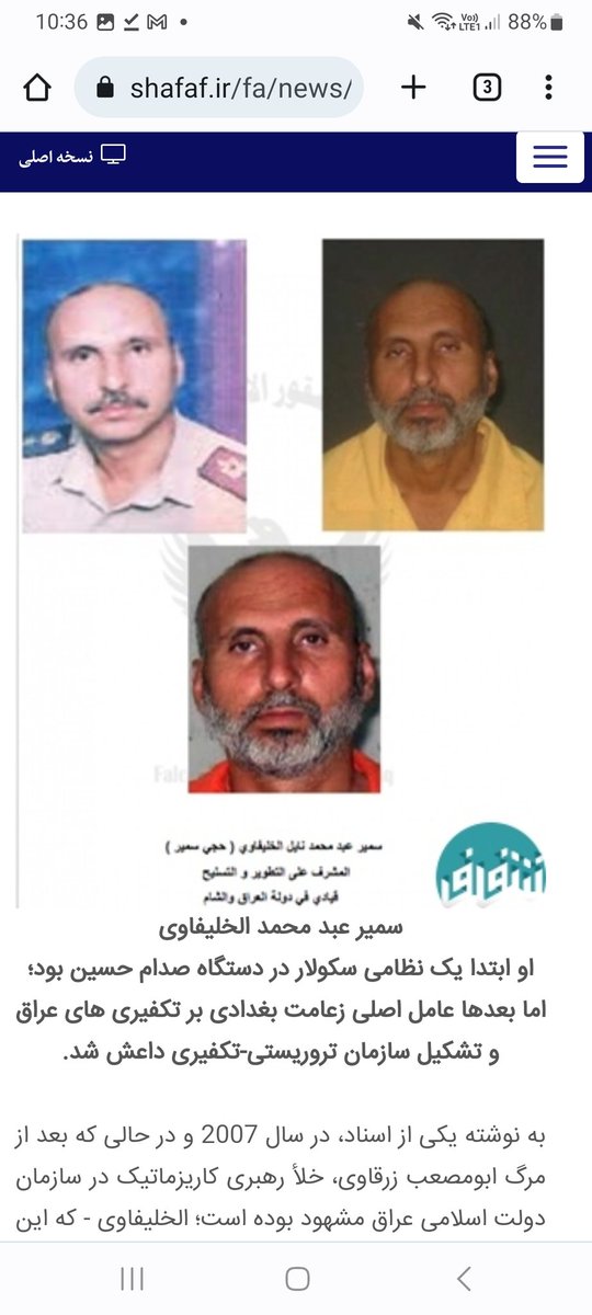 ۱۷۱- به مرور بسیاری از امرای انتسابی البغدادی در امور نظامی و سیاسی، نخبگان سابق ارتش صدام بودند که این انتخاب ها هرگز نمی توانسته تصادفی باشد. علاوه بر حجی بکر که بعدا در شمال سوریه توسط مخالفین اسد کشته شد، چند صدامیست دیگر نیز مهمترین عامل پیشرفت البغدادی و نهایتا داعش بودند.