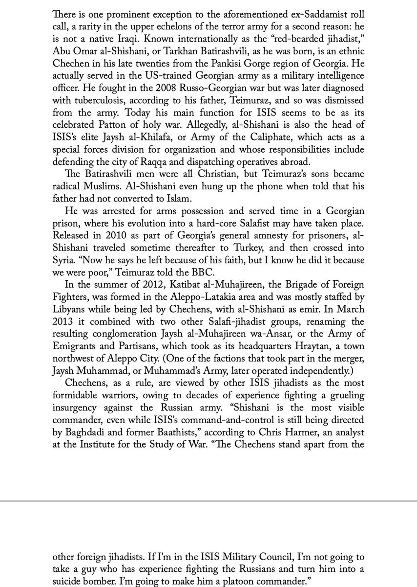 ۱۸۶- شجاع ترین و سرسخت ترین جنگجویان داعش بودند. افرادی با تجربه زیاد در آموزش های طاقت فرسای نظامی و تجربه جنگ با ارتش روسیه. به قول کریس هارمر از تحلیلگران موسسه مطالعات جنگ "اگر من هم در حلقه شورای رهبری و نظامی داعش بودم، کسی که تجربه کشتن روسها را دارد را تبدیل به یک بمب