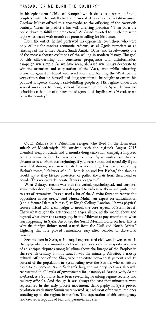 ۲۲۸- ابتدا تبدیل به یک تعبیر فرقه ای و رمزگونه شد برای یک جنگ مقدس شیعه اسلامگرا در برابر سنی هایی که در جمهوری وحشت اسد، دهه ها به شکلی پارانویا گونه، همه شان (از کودک، زن و مرد) دشمنان خاندان اسد فرض شده بودند. این آغازی بود که بعدها مردم سوریه به آن لقب "شورش سلیمانی" دادند.