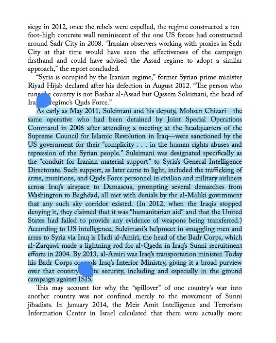 ۲۳۵- خود که به نیروی رزمی و زمینی سپاه پاسداران هم متوسل شد. اینها کسانی بودند که تجربه های عمیقی از سرکوب جنبش های دانشجویی و ضدحکومتی، بویژه تظاهرات های بزرگ ضد حکومتی در بهار و تابستان ۲۰۰۹ داشتند. سلیمانی به طور خاص به مجرای حمایت مادی و نظامی ایران به اسد شناخته میشد. این
