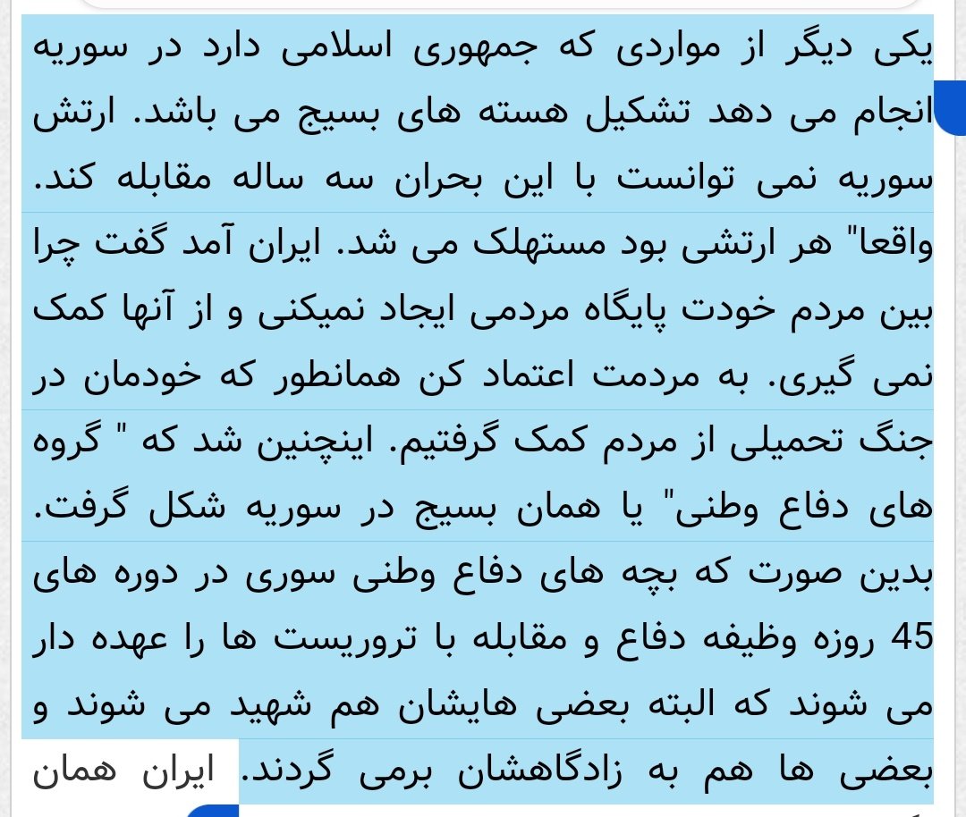 ۲۴۰- ارتش اسد خواسته بودند که تنها برای پاکسازی شهر نقش ثانویه را به عهده بگیرند و پس از سرکوب ناآرامی ها، در آنجا مستقر شوند و این بخشی از پروژه بلند مدت ج.ا در شیعه سازی مناطق سنی نشین بود.