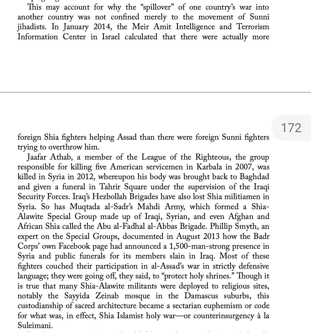 ۱۲۹- در آینده. هدف دوم او مشغول کردن جهادگران به جنگ عراق با امید کاهش تمرکز آنها بر رژیم خود بود. اسد بدرستی درک کرد که دولت بوش اگر بتواند با اشغال عراق به حکومت اقلیت بعث صدام پایان دهد، هدف بعدی میتواند خودش و میراث پدرش یعنی اقلیت بعثی سوریه باشد. بعدها "بسام برابندی"