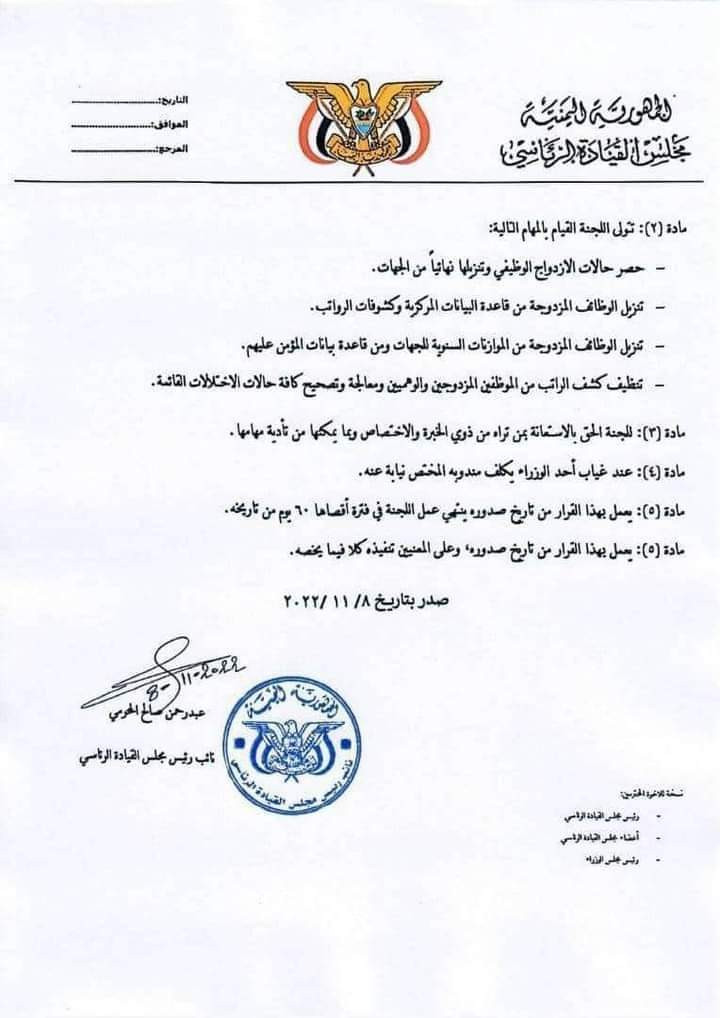 وأصدر الشيخ أبو زرعة المحرمي قرار رقم (2) لسنة 2022، بشأن تشكيل لجنة عليا للنظر في قوائم الموظفين المزدوجين في الجيش والأمن والقطاع المدني.