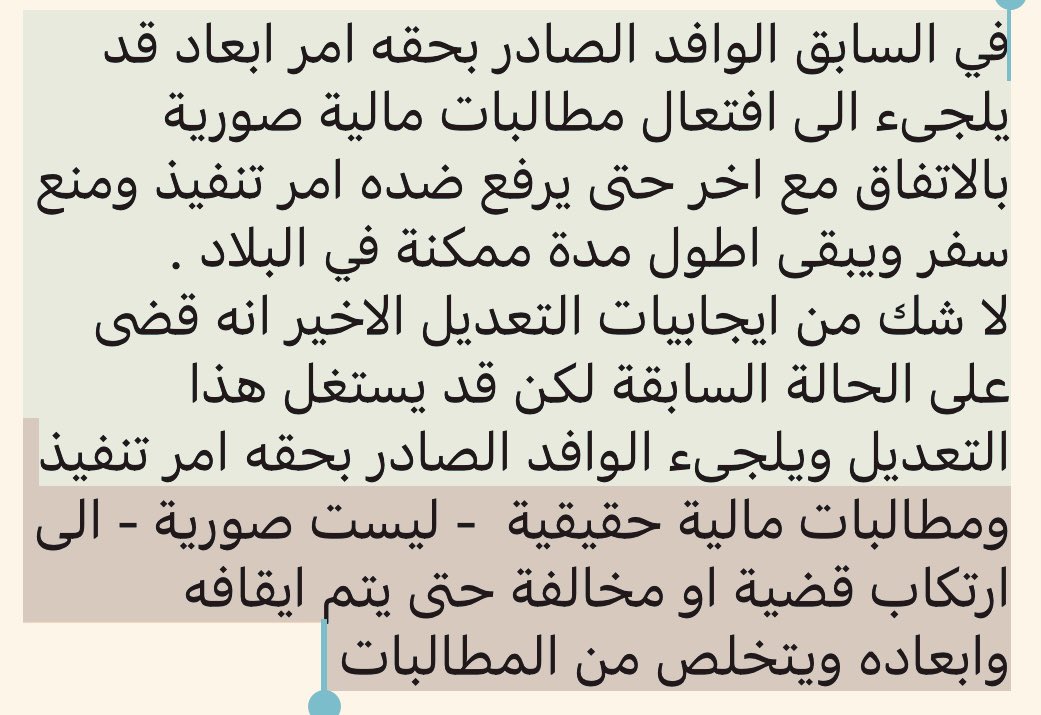 اخشى من ان ينتهز هذا التعديل كل مقيم صادر عليه اوامر تنفيذ في قضايا مالية وممنوع من السفر بسببها ، فيلجأ الى ارتكاب فعل جنائي او مخالفة إقامة من اجل ان تقوم الجهات المختصة بايقافه ثم الشروع في ابعاده الى بلاده وكذا خلاص ينجو من اوامر التنفيذ وتلك المطالبات !!