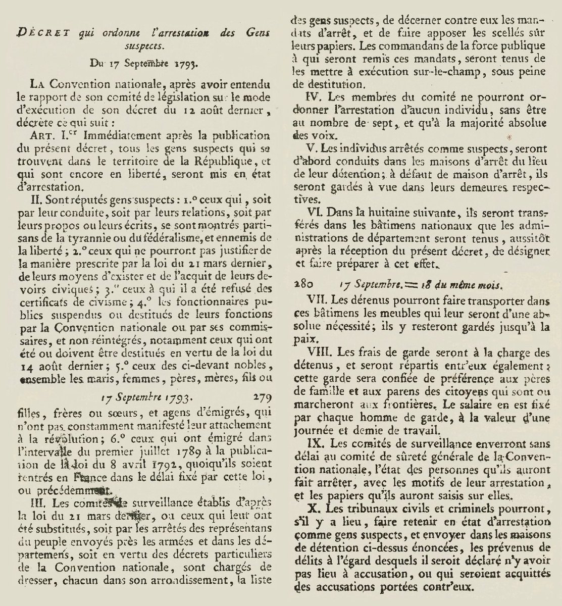 مظنون کسی است که خواه بواسطه رفتارش، روابطش،گفتار یا نوشته هایش، نشانی از طرفداری از رژیم ظلم نشان داده باشد، 🥴 هر کسی که در مقابل نجیبزادگان، پدر، مادر، خواهر، شوهر.... پیوسته علاقه و وابستگی عاطفی خود را به انقلاب ١٧٨٩ ابراز ننماید 😳۸