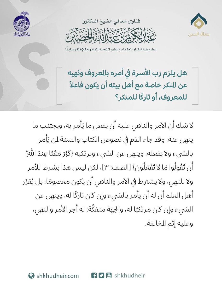هل يلزم رب الأسرة في أمره بالمعروف ونهيه عن المنكر خاصة مع أهل بيته أن يكون فاعلًا للمعروف، أو تاركًا للمنكر؟