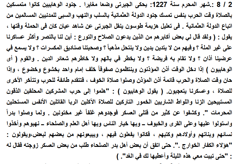 قال الشيخ سليمان بن عبد الله بن محمد بن عبد الوهاب عن العثمانيين: "ولا يخفى أي الحزبين أقرب إلى الله ورسوله، وإقام الصلاة وإيتاء الزكاة، أهل الأوثان والقباب والقحاب واللواط، والخمور والمنكرات، أم أهل الإخلاص، وإقام الصلاة وإيتاء الزكاة؟ "