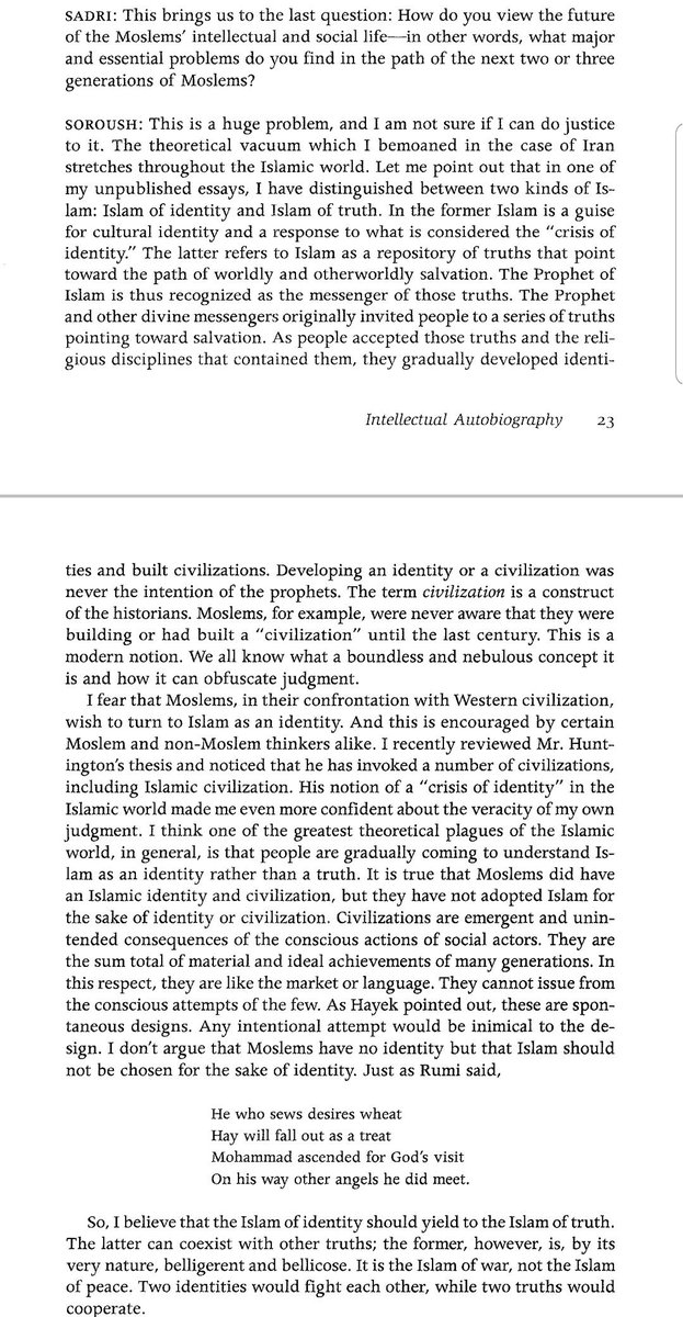 "لقد ميّزت بين نوعين من الإسلام: إسلام الهوية و إسلام الحقيقة: في الأول الإسلام مجرد مظهر زائق للهوية الثقافية و إستجابة لما يظن بأنه (أزمة هوية). الثاني يشير للإسلام كمصدر للحقائق التي تقود إلى طريق الخلاص الدنيوي و الأخروي."