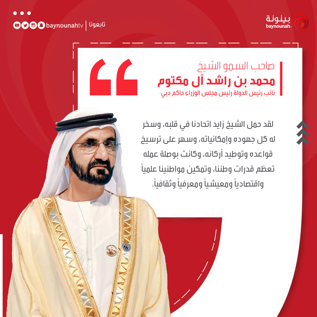 كلمة صاحب السمو الشيخ #محمد_بن_راشد بمناسبة #عيدالاتحاد51: "لقد حمل الشيخ زايد اتحادنا في قلبه، وسخر له كل جهوده وإمكانياته، وسهر على ترسيخ قواعده وتوطيد أركانه، وكانت بوصلة عمله تعظم قدرات وطننا، وتمكين مواطنينا علمياً واقتصادياً ومعيشياً ومعرفياً وثقافياً."