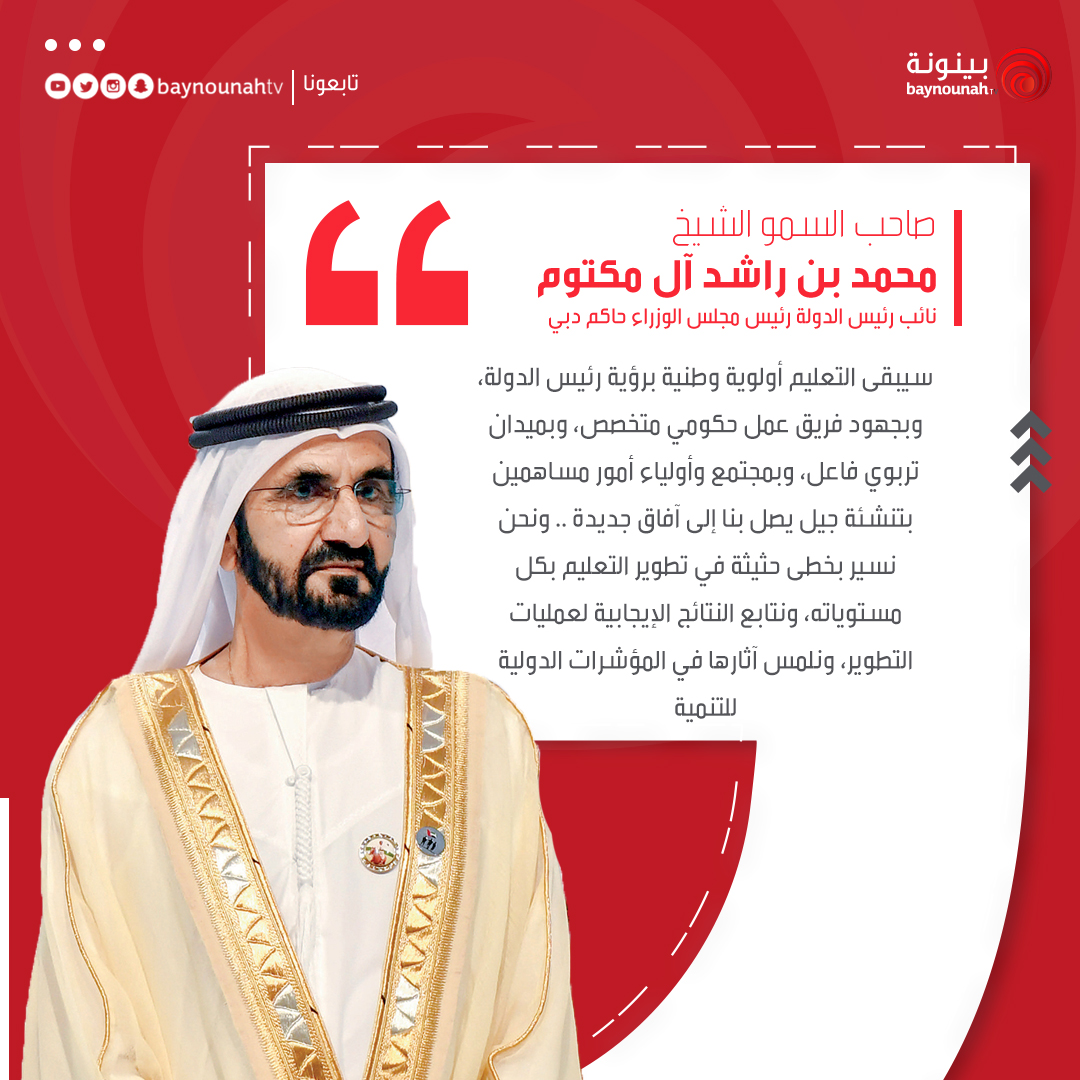 كلمة صاحب السمو الشيخ #محمد_بن_راشد بمناسبة #عيدالاتحاد51: "نحن نسير بخطى حثيثة في تطوير التعليم بكل مستوياته، ونتابع النتائج الإيجابية لعمليات التطوير، ونلمس آثارها في المؤشرات الدولية للتنمية "
