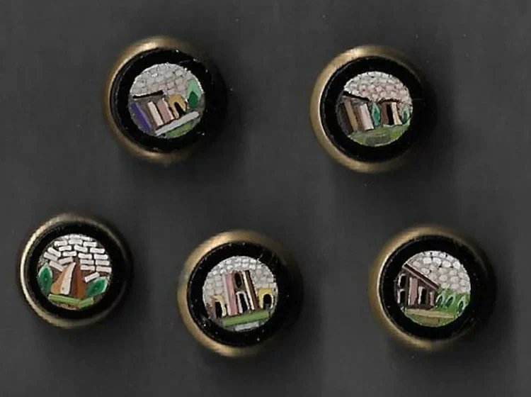 صنعت أزرار الفسيفساء من المواد العضوية، ومنها الحجر والقماش والخشب، وحتى أصداف الحيوانات البحرية مثل السلاحف وتأتي مجموعة أزرار الفسيفساء مكونة من 5 أزرار نحاسية، وتتمايز برسوماتها الزاهية من المنازل والطبيعةوتتوفر الأزرار هذه على Etsy مقابل 485 دولارًا.