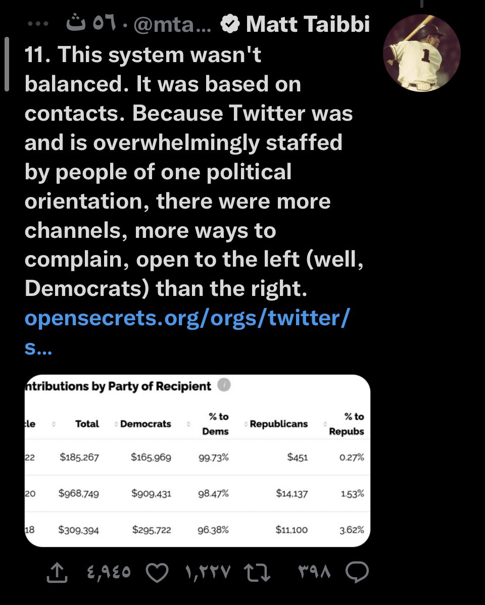 11. لم يكن هذا النظام متوازنًا. كان يقوم على الاتصالات. نظرًا لأن تويتر كان وما زال يعمل بأغلبية ساحقة من قبل أشخاص ذوي توجه سياسي واحد ، فقد كان هناك المزيد من القنوات ، وطرق أكثر للشكوى ، والانفتاح على اليسار (حسنًا ، الديمقراطيون) أكثر من اليمين. opensecrets.org…