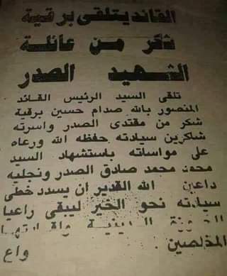 وفي ختام حديثه التلفزيوني دعا محمد الصدر الله العلي القدير أن يوفق القيادة وعلى رأسها السيد الرئيس القائد صدام حسين في إعادة الأمن والاستقرار وبناء وإصلاح ما دمر في مدينة النجف الأشرف والمدن العراقية الأخرى.
