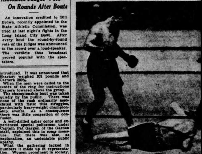 “L’italiano si muove come un peso piuma per un uomo del suo enorme peso. Poi colpisce ancora l’avversario con due destri al corpo [...]In quel preciso momento Sharkey subisce un terrificante uppercut destro alla mascella che quasi decapita il bostoniano”