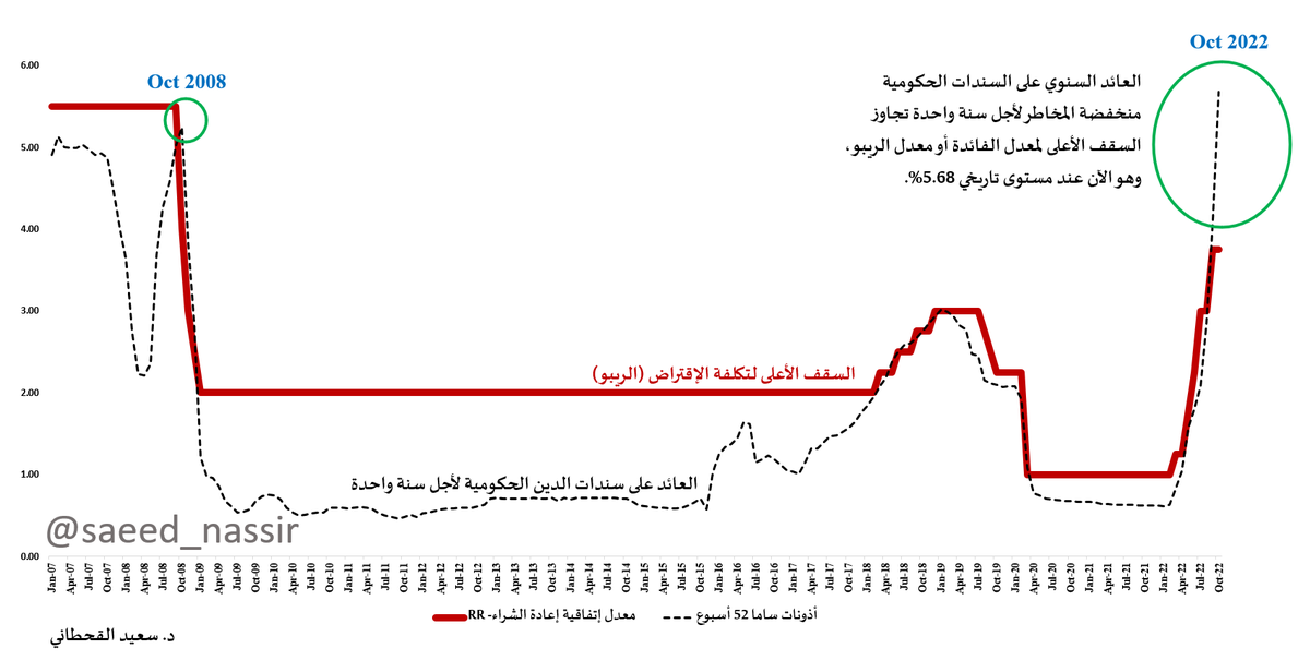 1⃣ العوائد على سندات الدين الحكومية قصيرة الأجل تجاوزت السقف الأعلى لتكلفة الاقتراض (الريبو)، ووصل العائد على إقراض الحكومة لمدة سنة إلى 5.68% بسبب تشديد السيولة النقدية. نفس الارتفاع حدث في أكتوبر 2008 وعندها أنهى #تاسي التصحيح بنسبة انخفاض 45%؟وبدأت دورة أسعار الفائدة المتدنية