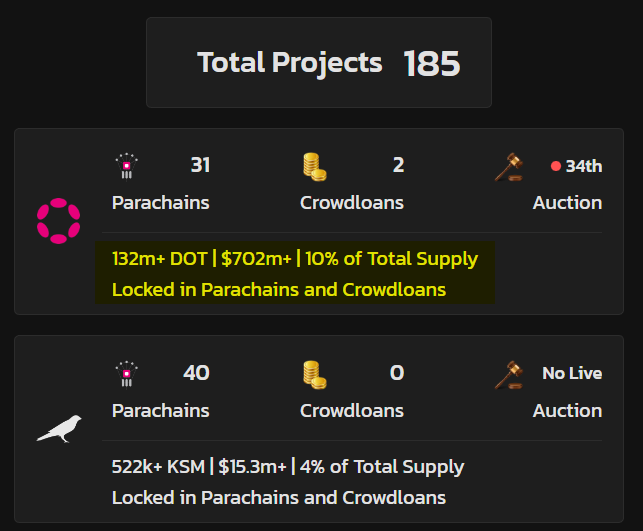 عندما ننظر إلى نظام بولكادوت الحالي سنجد أن هناك 31 مشروع ضمن الـParachains. تم التصويت لصالح هذه المشروعات عبر تكديس 132 مليون عملة #DOT أو حوالي 10% من السبلاي الإجمالي.