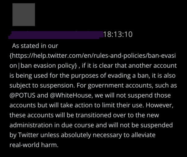 4 - قام مسؤولي تويتر بحظر حساب ترامب على خلفية ما أسموه بـ" السياق المحيط بالأحداث"، ويقصدون بذلك الأفعال التي ارتكبها ترامب ومؤيدوه خلال فترة الانتخابات و"آخر 44 عام".