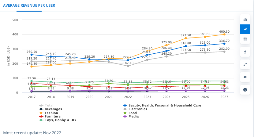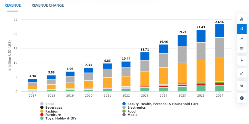 بحسب منصة Statista، من المتوقع أن تصل الإيرادات في سوق التجارة الإلكترونية في المملكة إلى 10.44 مليار$ لهذا العام 2022.