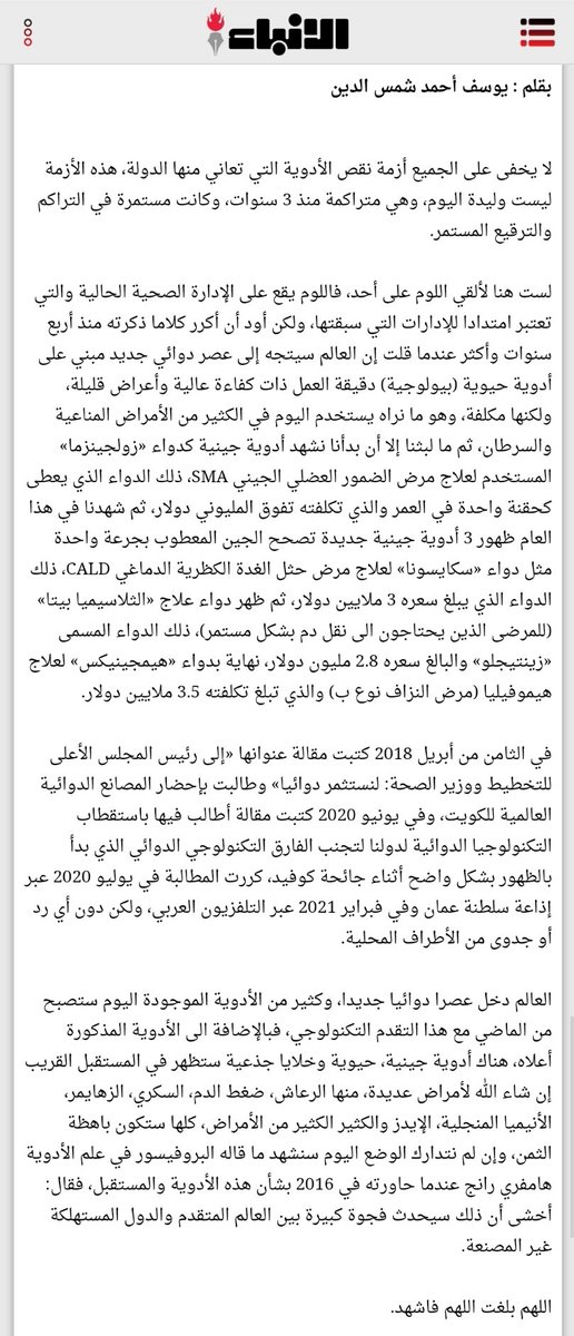 هذه سلسلة من ١١ تغريدة للجميع، وللسادة أعضاء مجلس الأمة وأعضاء الحكومة والتخطيط، بشأن نقص الأدوية المطروح على جدول جلسة الثلاثاء