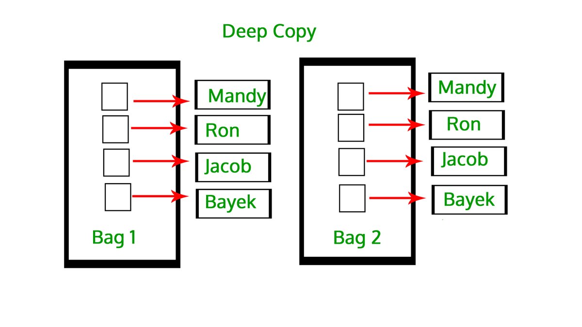 Deep copy: construit un nouvel objet composé puis, récursivement, insère dans l'objet composé des copies des objets trouvés dans l'objet original.