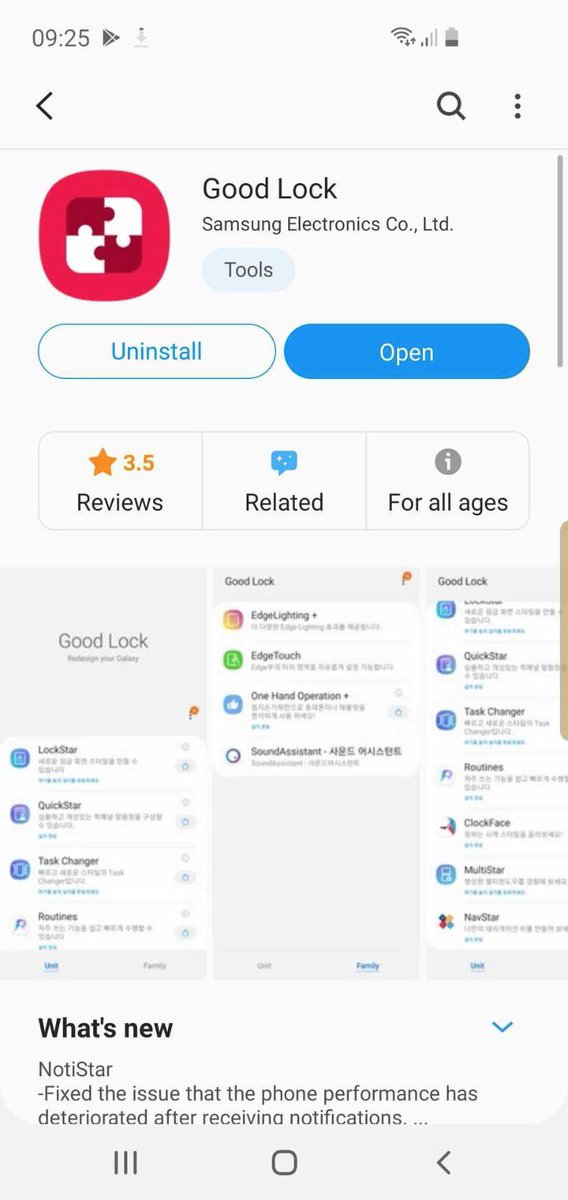 يمكن تحميل هذا التطبيق مباشرة من متجر جالكسي، وحالياً لا يدعم اللغة العربية. Good Lock هو تطبيق صممته سامسونج ويسمح بتخصيص تجربة هاتف Galaxy أو اللوحي بالكامل، ويتيح تغيير أسلوب الهاتف مثل تغيير مظهر مشغل المهام واستبدال الرموز الموجودة على شريط التنقل.