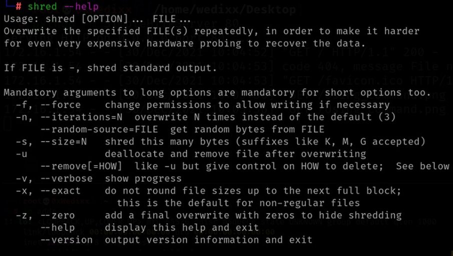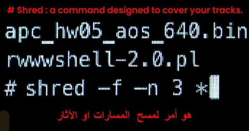 مثل ما هو ظاهر، الأمر shred قام بالكتابة فوق الملف النصي 3 مرات والآن الشيء الوحيد المتبقي من هذا الملف هو نص غير قابل للفك، هذا بالضبط ما سيشاهده المحقق الجنائي الرقمي ! Shred هو أمر رئيسي لتغطية مساراتك، مما يجعل أوامرك وأفعالك غير قابلة للاسترداد !