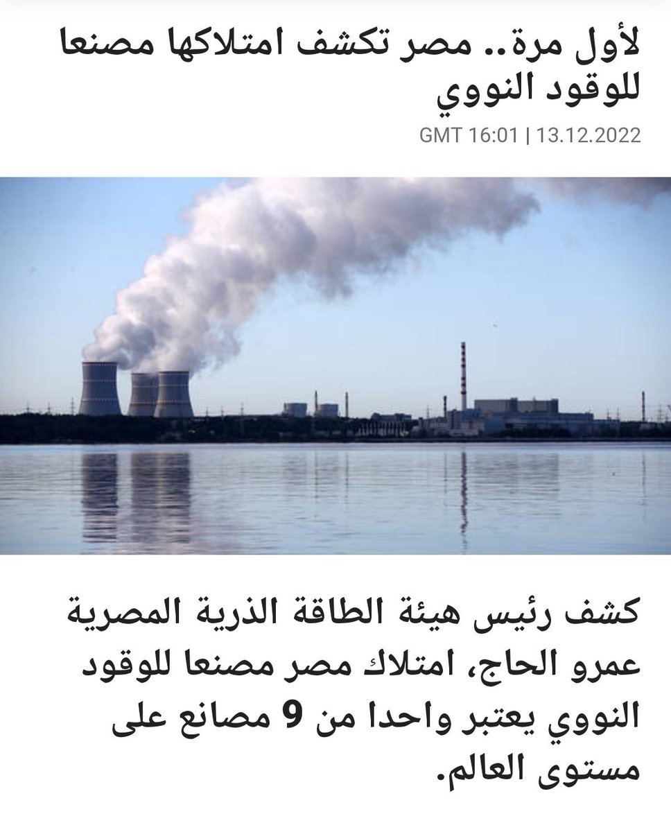 ● رئيس هيئة الطاقة الذرية المصرية الأستاذ عمرو الحاج، أعلن عن امتلاك مصر مصنع للوقود النووي ! ويعتبر واحد من 9 مصانع على مستوى العالم فقط