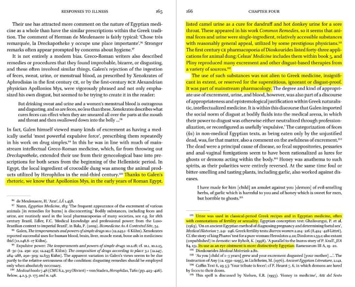 Europe originate from ancient Egypt, Greece and Rome. While many of the advances of antique medicine were forgotten after the fall of the Roman Empire, the use of urine and other excrements enjoyed continued popularity in mediaeval times. Ancient Indian yogic texts and ancient