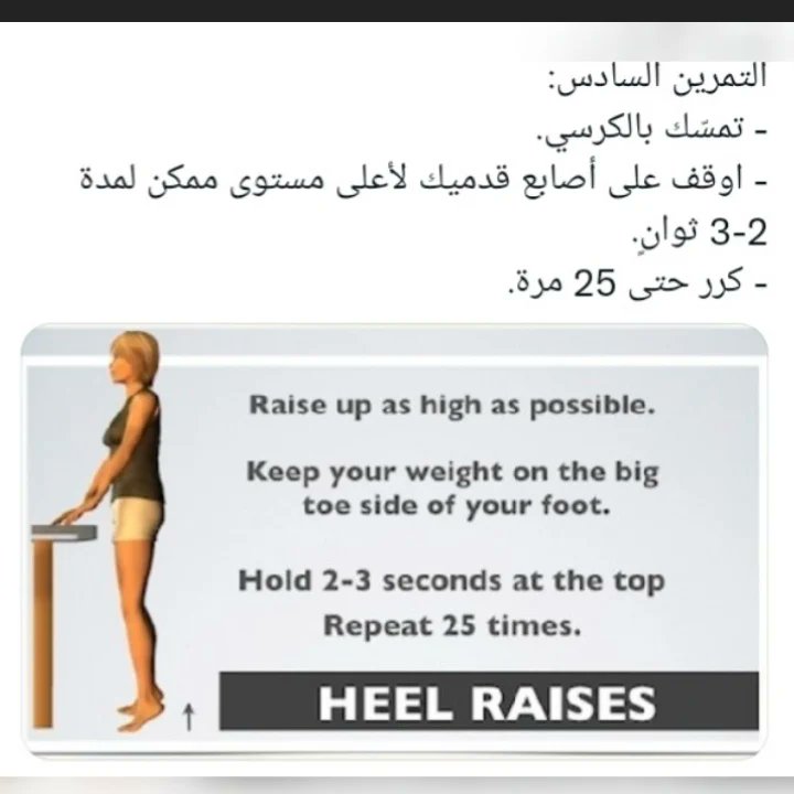 - ٧ تمارين مبدئية وسهلة يمكن القيام بها في المنزل بأنتظام عدة مرات في اليوم من دون اشراف.