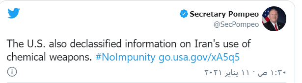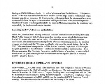 وأكدت الولايات المتحدة أن إيران تمتلك أسلحة كيماوية وأنها نجحت في تطوير بعض أنواع القذائف، بل إنها تسعى للحصول على مواد كيماوية لأغراض لا تتوافق مع اتفاقية حظر الأسلحة الكيماوية وهو ما يثير المخاوف.