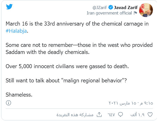 [إنَّ التحليلات المُختبرية أظهرت إن السلاح الكيمياوي المستعمل في معركة حلبجه هو(هيدروجين السيانيد) والذي تمتلكهُ الترسانة الإيرانية وإن المعلومات المتوفرة لدى دوائر الإستخبارات الأمريكية تؤكّد إنَّ العراق لم يشتري هذا النوع من السلاح ولم يستطيع أن يُنتج هذا النوع من السلاح].