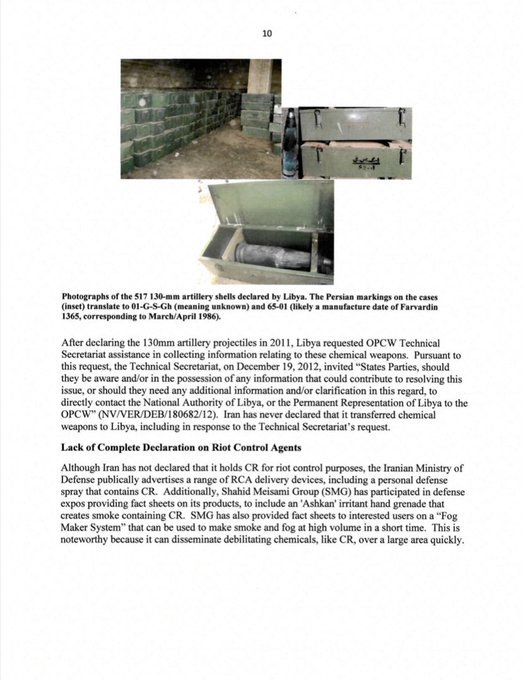 وبحسب التقرير، عثر المجلس الوطني الانتقالي الليبي في أعقاب انهيار نظام القذافي على قذائف مدفعية عيار 130 ملم مملوءة بخردل الكبريت يُعتقد أن مصدرها إيران.