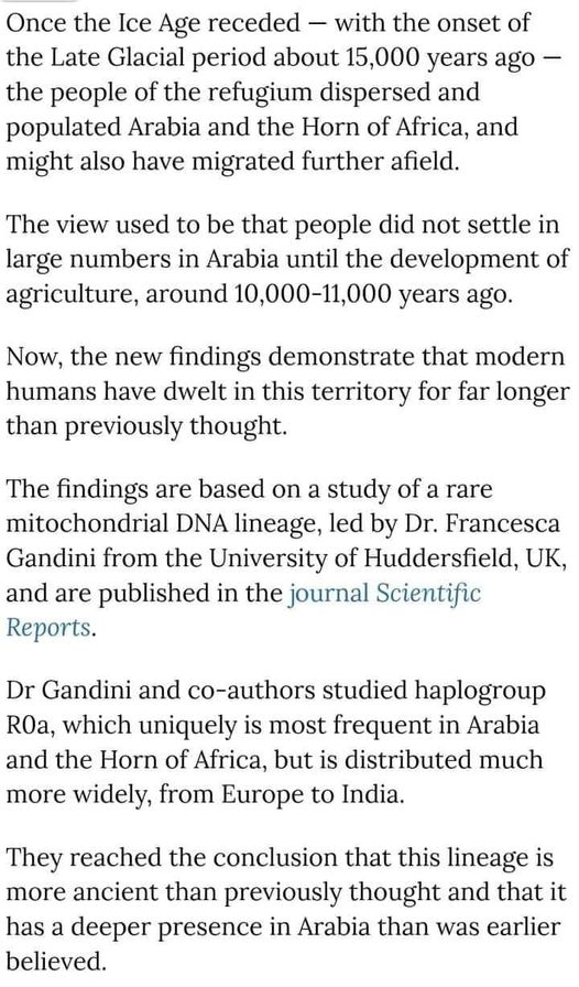 وَجَد العلماء أيضًا أن: "الحلقة الرئيسية من إنتِشار البشر إلى شرق إفريقيا ، على الأقل فيما يتعلق بسُلالات الأمهات ، كانت في نهاية أواخر العصر الجليدي ، بسبب التوسعات الكبيرة من واحدة