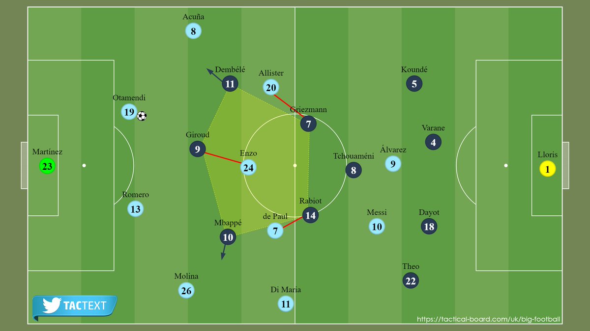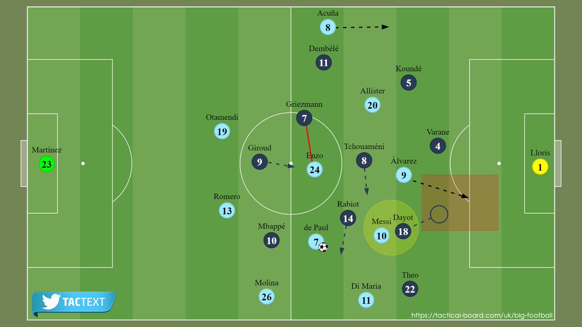 ▪️ محاولة استغلال شكل فرنسا #FRA الدفاعي والذي قد يمنح ميسي مساحة جيدة بين الخطوط (⚠️ تفصيل هذه النقطة تالياً)