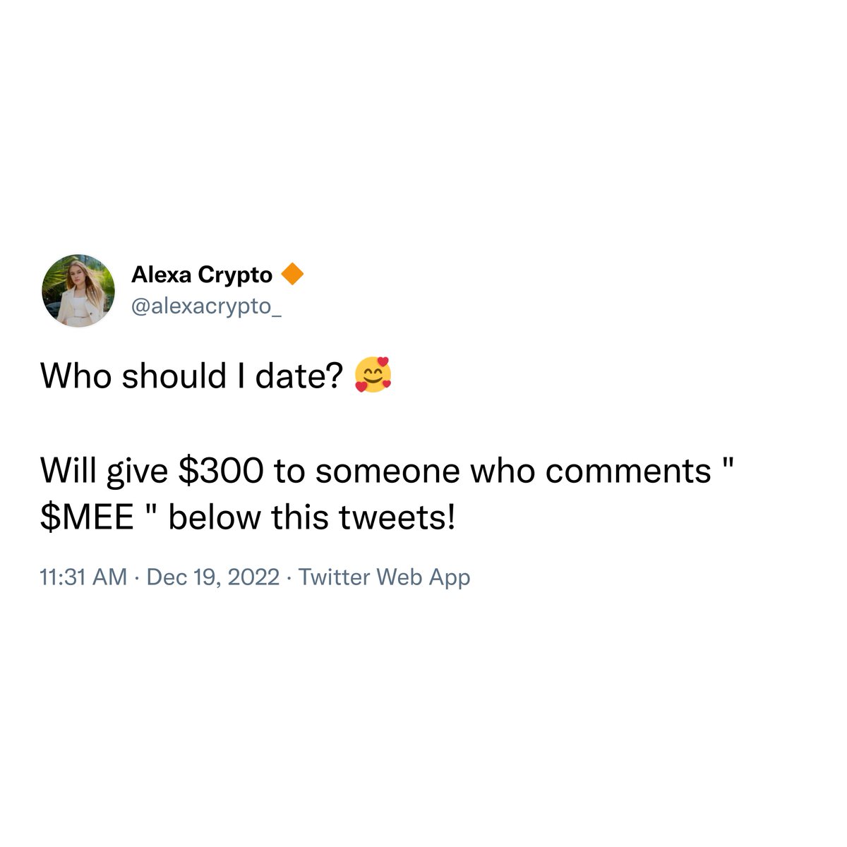 🚨 Tutaj "cringe" sięga zenitu. Za napisanie $MEE w komentarzu możesz wyrwać kilka dolców. A może uda Ci się w końcu umówić na randkę? Wystarczy, że pomożesz zwiększyć zasięgi swoim przyjaciołom influencerom.