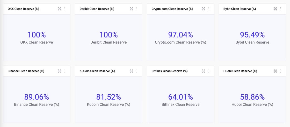 مؤشر "Clean Reserve" هو فقط مقدار إجمالي الاحتياطيات الخاصة بكل منصة التي لا تتضمن عملات المنصات الخاصة.