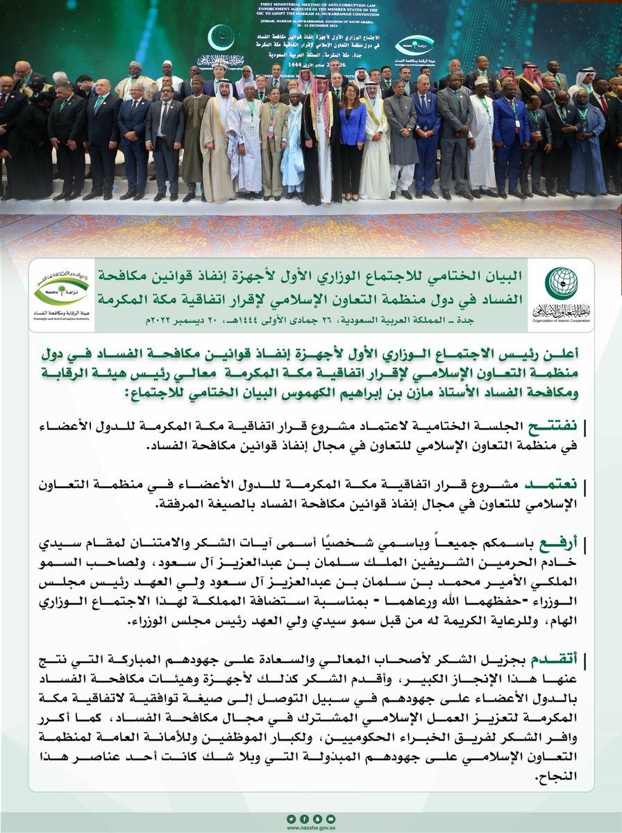 واليوم في البيان الختامي للاجتماع تم اعتماد مشروع قرار اتفاقية مكة المكرمة للدول الأعضاء في #منظمة_التعاون_الإسلامي في مجال إنفاذ قوانين مكافحة الفساد.