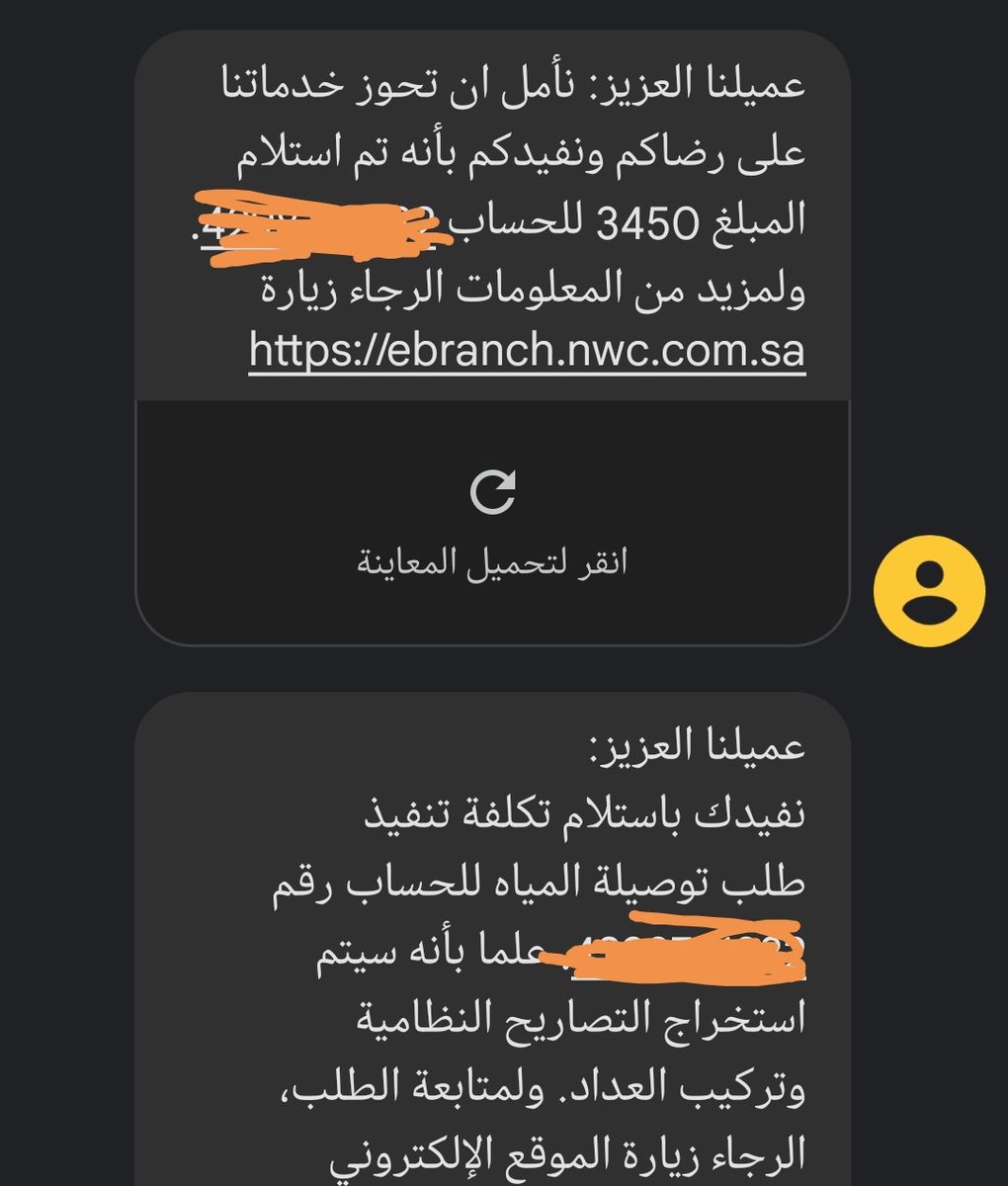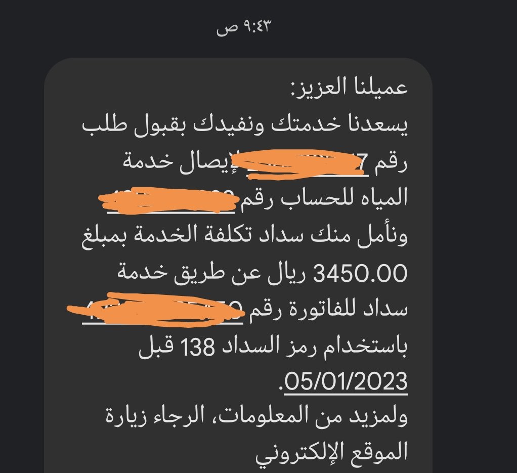 ▪️تصلك رسالة أخرى بعدها بدقائق نفيدك باستلام المبلغ وتأخذ إجراءات التصريح والحفر وتركيب العدادت خلال ٣٠ يوم وفي الأغلب خلال اسبوعين يكون راكب العداد ويتم تشغيله خلال ٢٤ ساعة .
