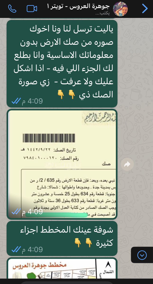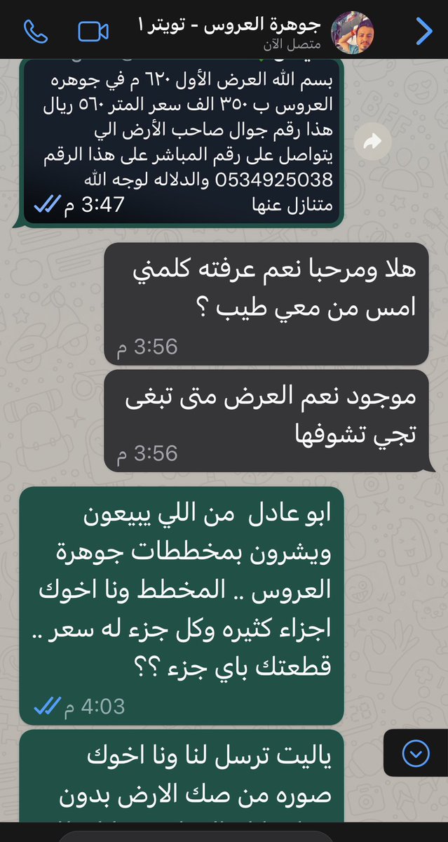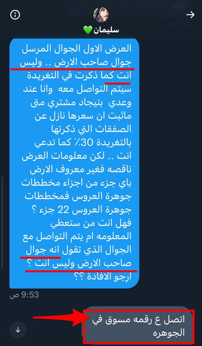 @almasoudi10 @Suli19881988 المليح وضع هذا العرض (من كيسه ) لعرض وهمي يقول انه بالجوهرة ووضع به جوال يقول انه لصاخب الارض وانه كوسيط متنازل عن الدلاله (لوجه الله😂😂) وفعلا ارسلتها لاحد الاصدقاء ممن يعمل بمخططات الجوهرة وبالتدقيق ماذا وجدنا ان سليمان وضع جواله شخصيا منتحلا شخصية صاحب الارض الوهمية تابع👇